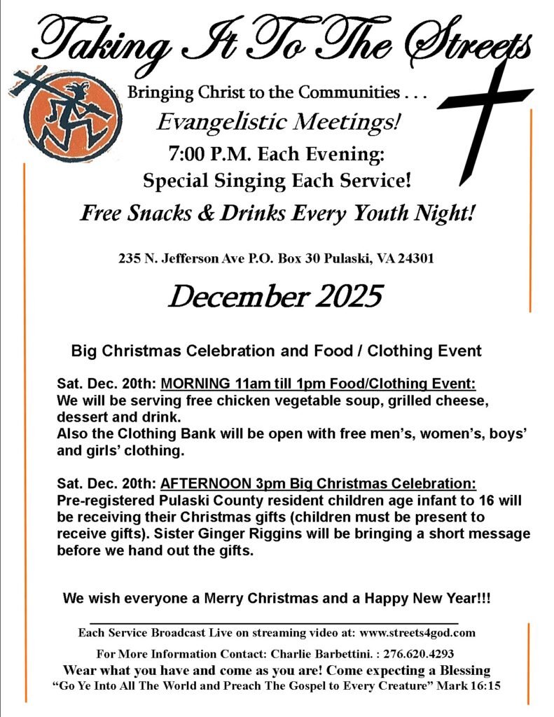 Also Christmas Sign-ups begin on the 22nd and go through December 6th for Pulaski County resident children infant to 16 yrs old. Our Big Christmas Celebration will be Saturday December 20th at 3 pm. Please see attached flyer for the information.