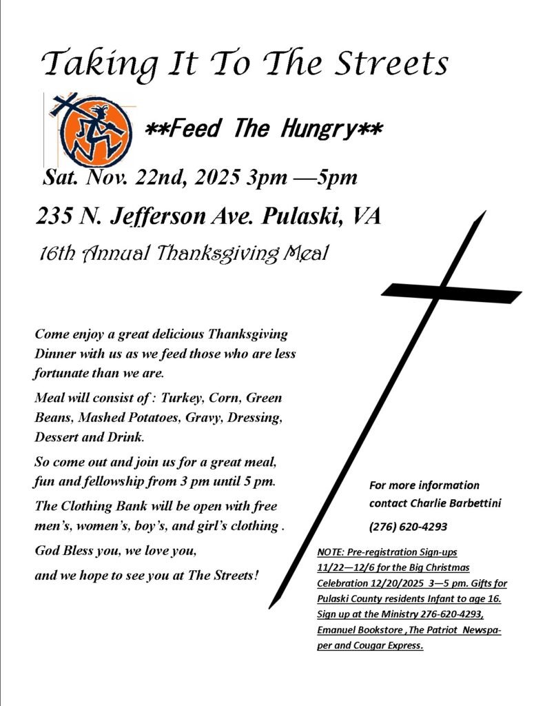 16th Annual Feed The Hungry Thanksgiving Meal, Big Christmas Celebration Sign-Ups, Clothing Bank at The Streets this weekend Sat. Nov. 22nd 3 pm till 5 pm.